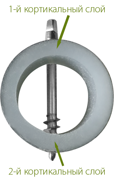 имплантаты, предназначенные для остеофиксации, закрепляются во 2-м кортикальном слое. Периимплантит не возникает, так как стержни имплантатов тонкие и полированные. Передача нагрузки на кость происходит в области 2-го кортикального слоя. Принцип "бикортикальной" фиксации был заимствован из травматологии, где он используется примерно с 1975 года. Этот тип фиксации позволяет работать в протоколах немедленной функциональной нагрузки.
